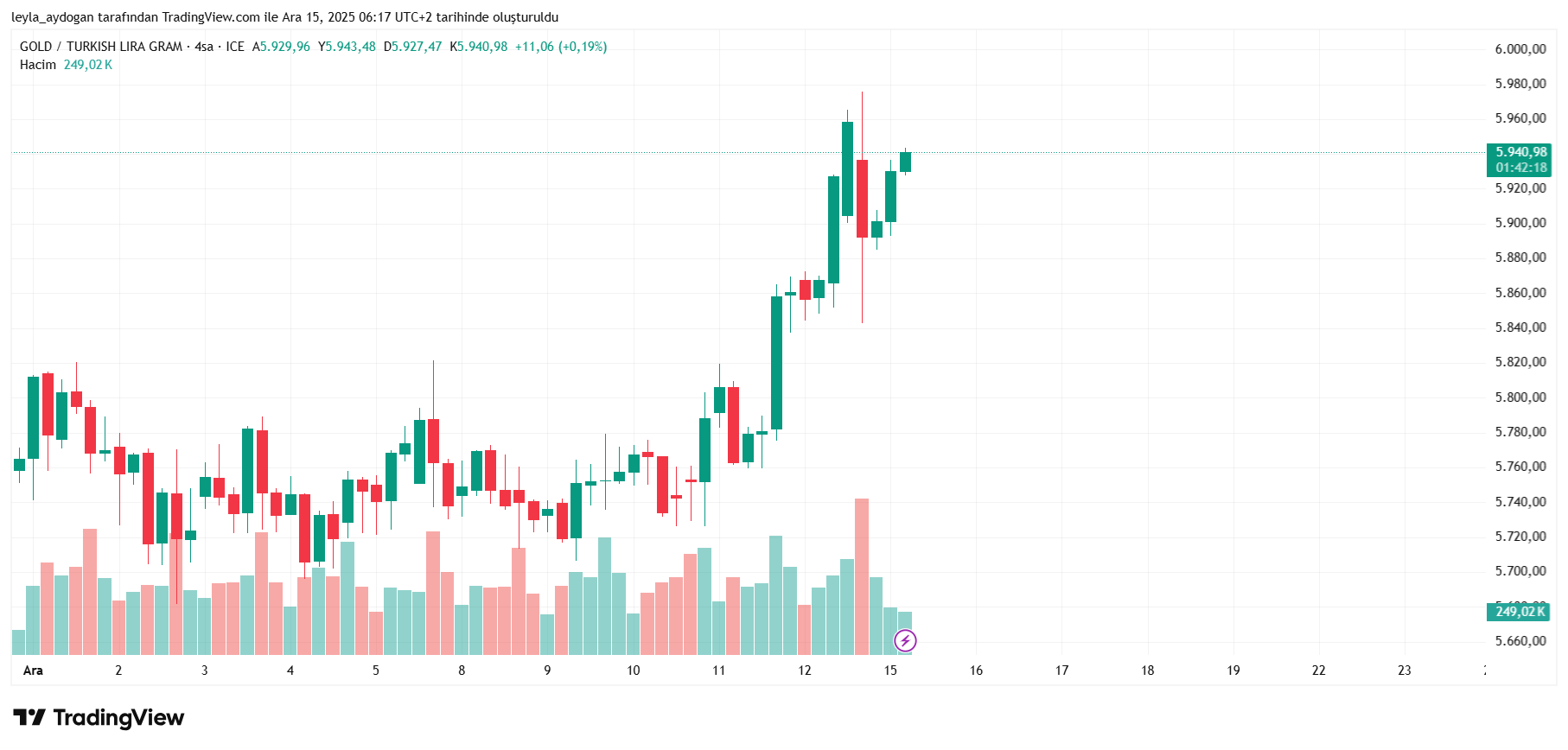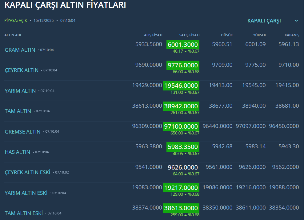 Yurt içinde ise altın fiyatları yukarı yönlü seyrini sürdürüyor. Spot piyasada 15 Aralık 2025 tarihli işlemlerde gram altın, TSİ 07.15 itibarıyla 5.941 TL seviyesinden güne başladı. Kapalıçarşı’da sabah saatlerinde fiziki gram altın satış fiyatı 6.000 TL’yi, çeyrek altın satış fiyatı ise 9.772 TL’yi gördü.