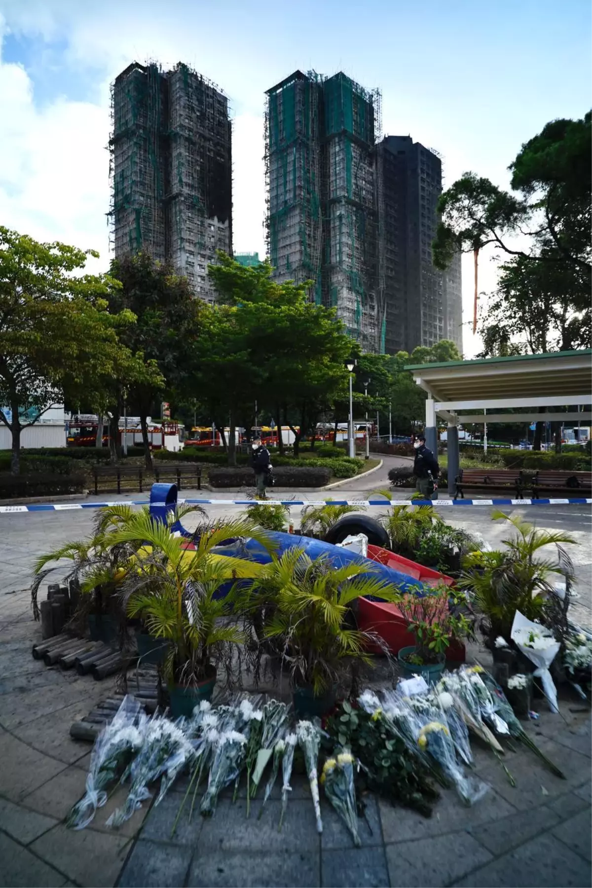 HONG KONG, 29 Kasım (Xinhua) — Çin’in güneyindeki Hong Kong’un Tai Po bölgesindeki Wang Fuk Court sitesinde çıkan yangında hayatını kaybedenleri anmak için olay yerine yakın bir alana çiçekler ve notlar bırakıldı.