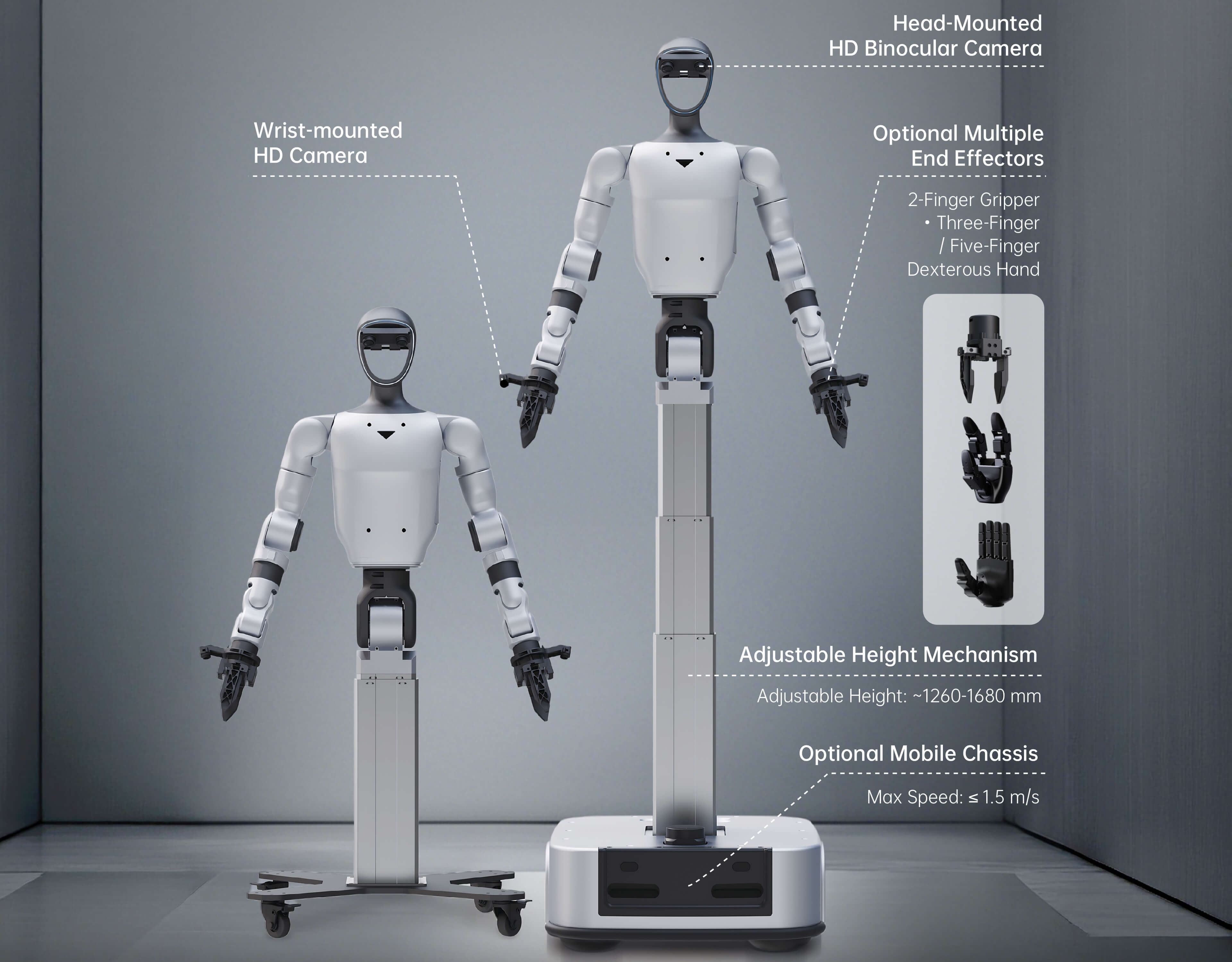G1-D, iki ayaklı kardeşlerinde yer alan karmaşık yürüyüş mekanizmalarını bırakarak tekerlekli bir tabana geçiyor. Bu tercih, arazi uyumluluğunu azaltırken daha yüksek stabilite, daha iyi yük taşıma kapasitesi ve önemli ölçüde uzamış pil ömrü sağlıyor. Model, Standart ve Flagship olmak üzere iki sürüm halinde sunuluyor. Flagship versiyonu, robotun yüksekliğini 126 ila 168 cm arasında değiştirebilen teleskopik bir gövdeye sahip. Bu sayede robotun çalışma aralığı zeminden üst raflara kadar uzanan geniş bir dikey hacmi kapsıyor.